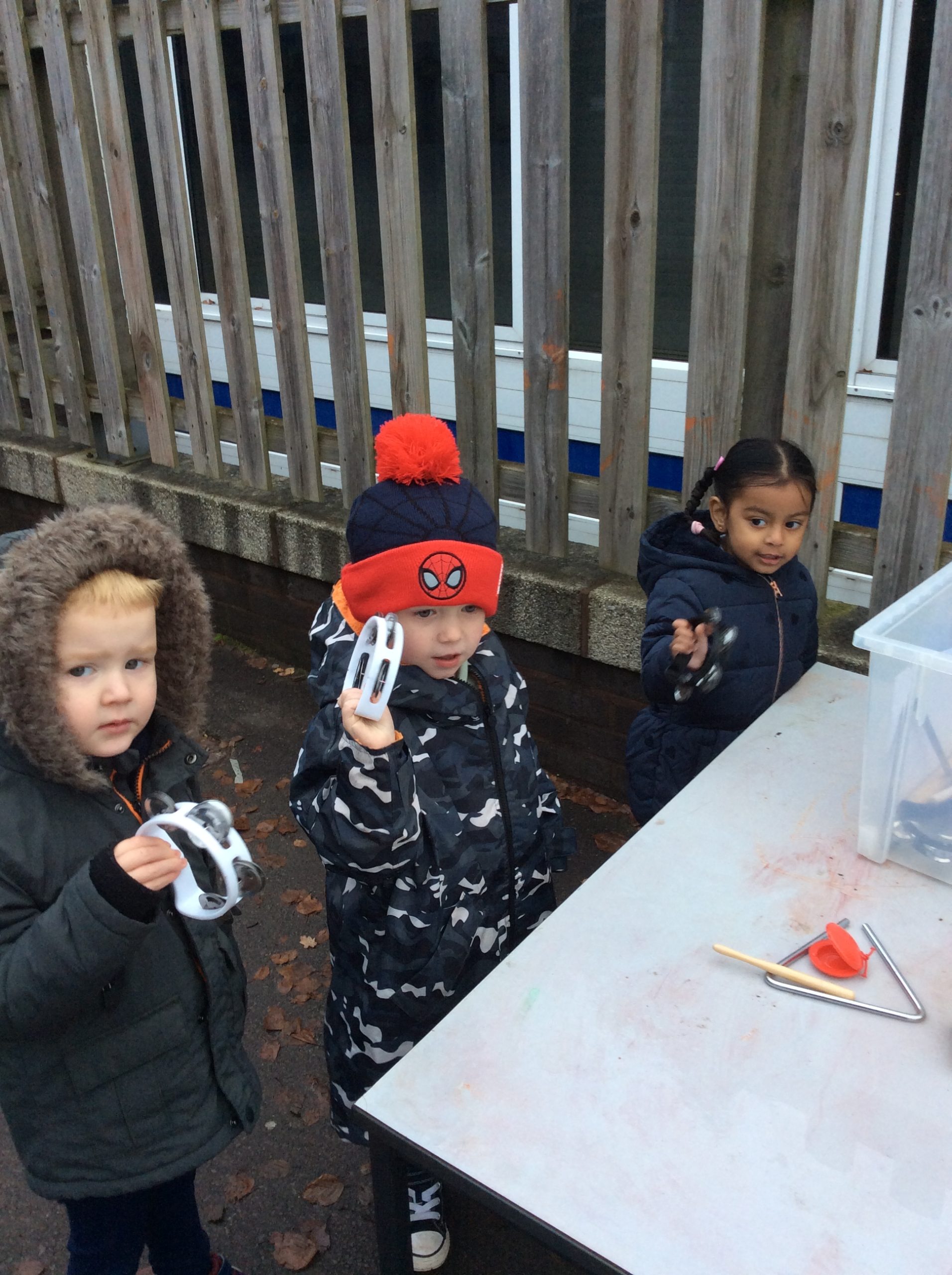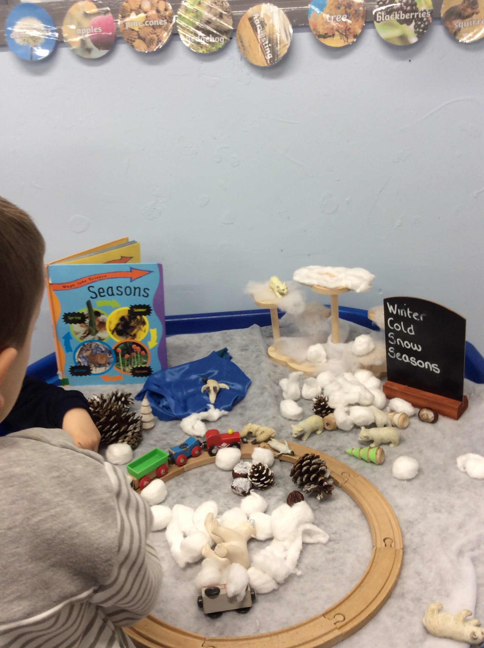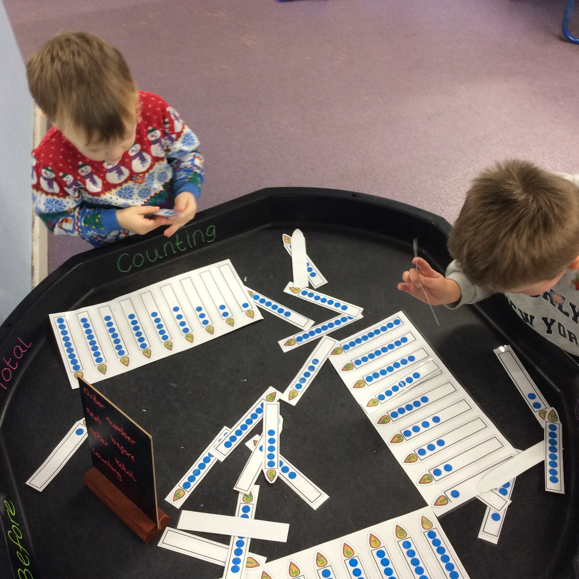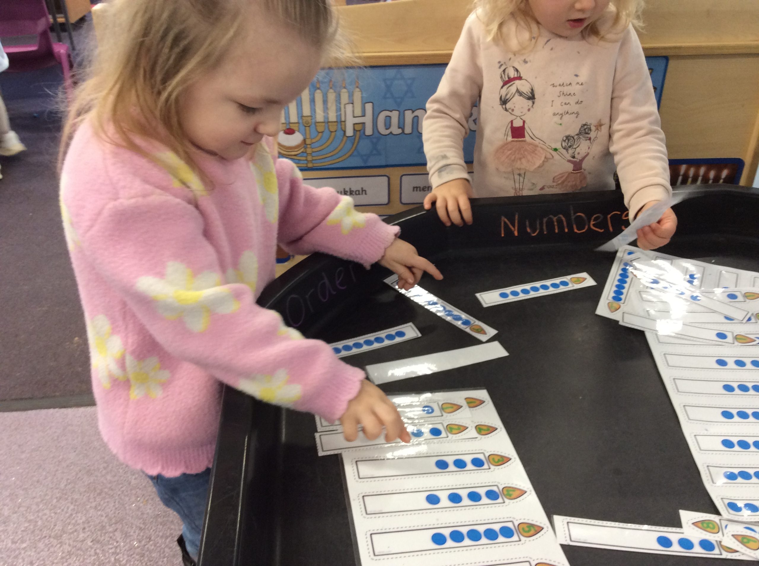 This week the children have been looking at Hanukkah. They have enjoyed making play-dough menorahs and practicing their counting with adding candles to the menorah. The children also enjoyed playing the percussion instruments while singing the Dreidel song. The children have also begun to make some of their Christmas crafts. This week also saw the change of the seasonal tuff-tray from Autumnal to Winter, where they were exploring a winter wonderland.